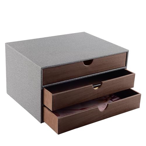 XNONE Home Office – Cassettiera da scrivania con 3 scomparti chiusi A4, in pelle PU, organizzatore per gioielli, apertura a forma di U, cuciture cucite a mano (grigio)