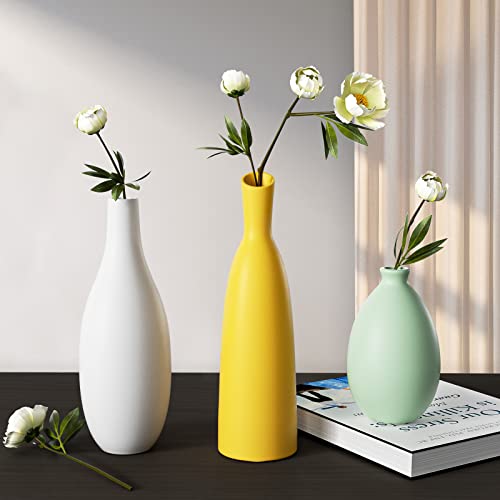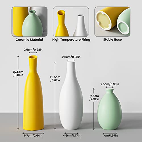 Set di 3 vasi minimalisti con aperture strette. Abbiamo progettato questo set di vasi stretti con 3 colori chiari e luminosi (bianco, giallo e verde), che hanno un aspetto unico e di grande impatto visivo; un adulto può tenere ogni piccolo vaso facilmente con una sola mano. Possiamo inserire uno o pochi fiori in ogni vaso per creare la nostra decorazione personale, che è divertente e renderà la nostra stanza bella, elegante e unica.