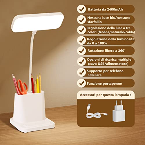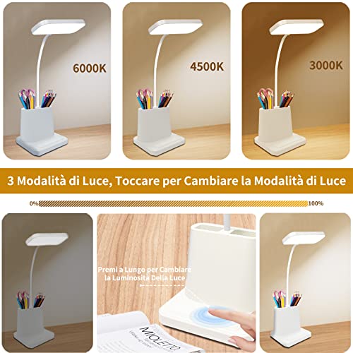 Tihokile Lampada da Scrivania LED Protezione Degli Occhi, Lampada da Tavolo con 3 Modalità di Illuminazione, Lampada Scrivania Touch Wireless con Porta di Ricarica USB/Porta Penne/Porta Telefono