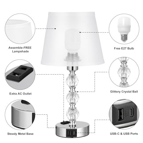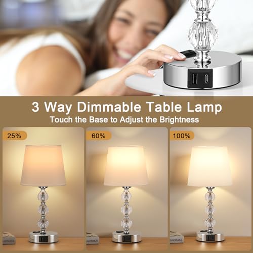 Set di 2 Lampade da Comodino in Cristall, Abat Jour da Comodino Touch Dimmerabile a 3 Vie con Porte USB-A+C+2 Presa CA, Lampada da Tavolo per Camera da Letto Soggiorno Ufficio(2 Lampadine Incluse)