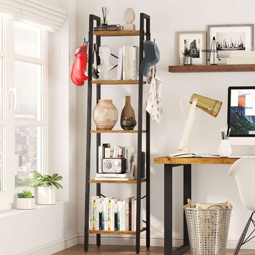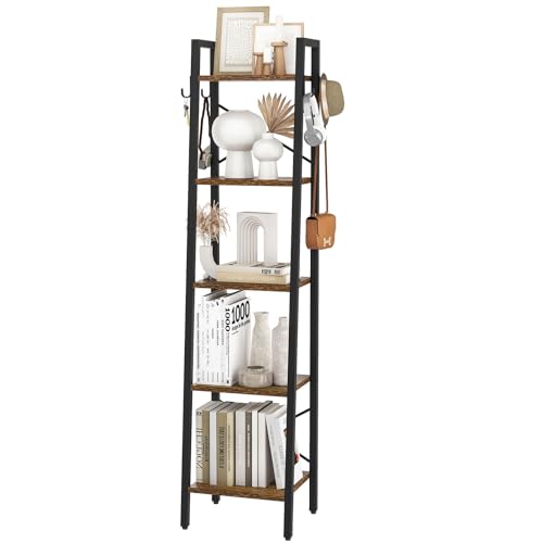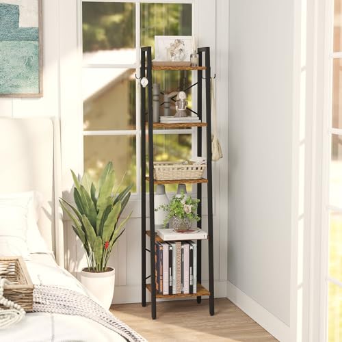 YMYNY 160CM Scaffale a Scala con 5 Ganci, Libreria a 4 Ripiani, Scaffale Portaoggetti, per Soggiorno Camera da Letto Cucina Studio, Stile Industriale, Struttura in Metallo, Marrone Vintage HBC025H