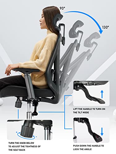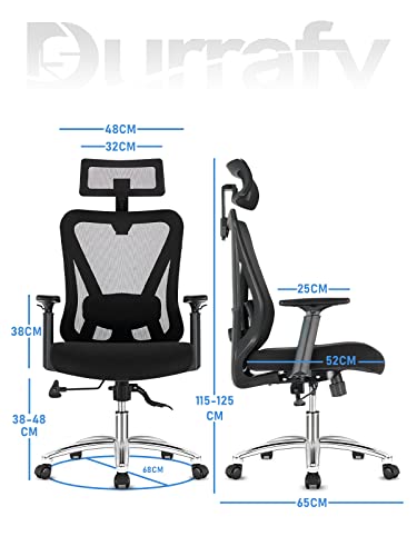 Durrafy Sedia da ufficio Ergonomica,Sedia Girevole con poggiatesta,supporto lombare,braccioli e regolazione in altezza, Sedia Scrivania Funzione di Bloccaggio a 130°, Capacità di Carico 150KG