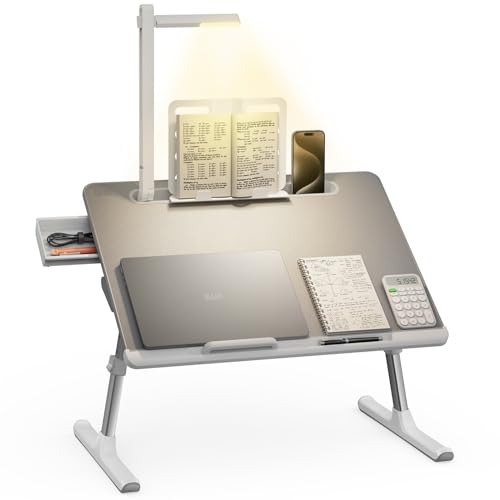 Tavolino da letto, Tavolo da letto SAIJI con lampada a LED, regolabile in altezza, con supporto per libri, cassetto, ferma strappo, vano per tablet (Grigio)