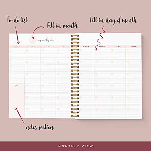 Il mio piano mensile: elenca le tue attività, le faccende e le commissioni per il mese nella sezione della visualizzazione mensile. Ogni mese ha una sezione Elenco delle cose da fare e note, nonché aree vuote da inserire nella data appropriata.