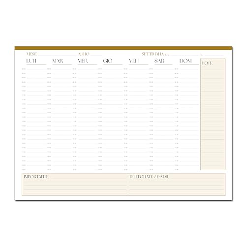 Completamente italiano, questo planning mensile formato A4 (27,9x21cm) è composto da 53 fogli di carta classica a strappo, con intervalli orario da 30 minuti, dalle 8 alle 19:30, progettato per gestire al meglio i tuoi impegni