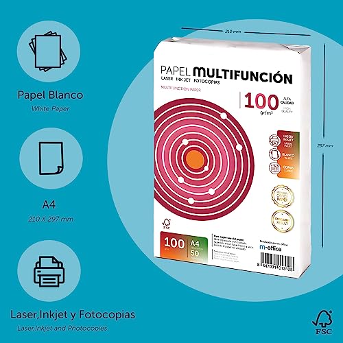 Foglio A4 100 gr 50 fogli di carta multifunzione per stampanti laser e ad iniezione, fotocopiatrice, fax, per uso ufficio, materiale scolastico, confezione fogli. M-Office